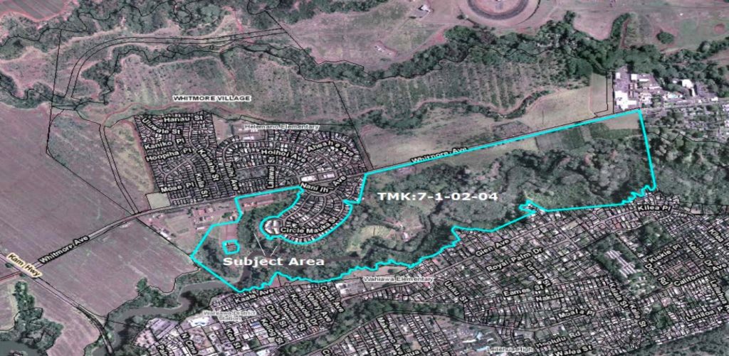A recent ADC staff report states that a portion of the land along Uluwalu Circle that abuts the Whitmore Circle apartments has been “plagued with criminal trespassing for years,” resulting in some of the problems there today. The February 14, 2014, appraisal for the property, prepared for the Trust for Public Land by John Child & Company, fails to mention any such issues. The only improper use of the land noted in the appraisal was the construction by Waihii Farms, a tenant on the land for decades, of several unpermitted structures on 16 acres along Kaukonahua Stream.