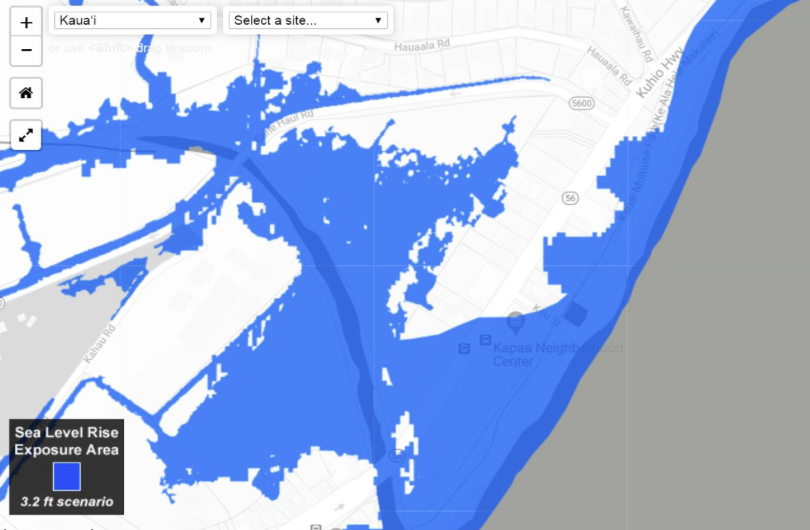 “That’s where we got into problems,” Hull said. He showed the commission a map of Kapa‘a town with the 3.2-foot sea level rise exposure area shaded in dark blue: A narrow strip hugged the coast, then sprawled inward, forming a jagged-edged blob surrounded by long, thin branches and errant patches.