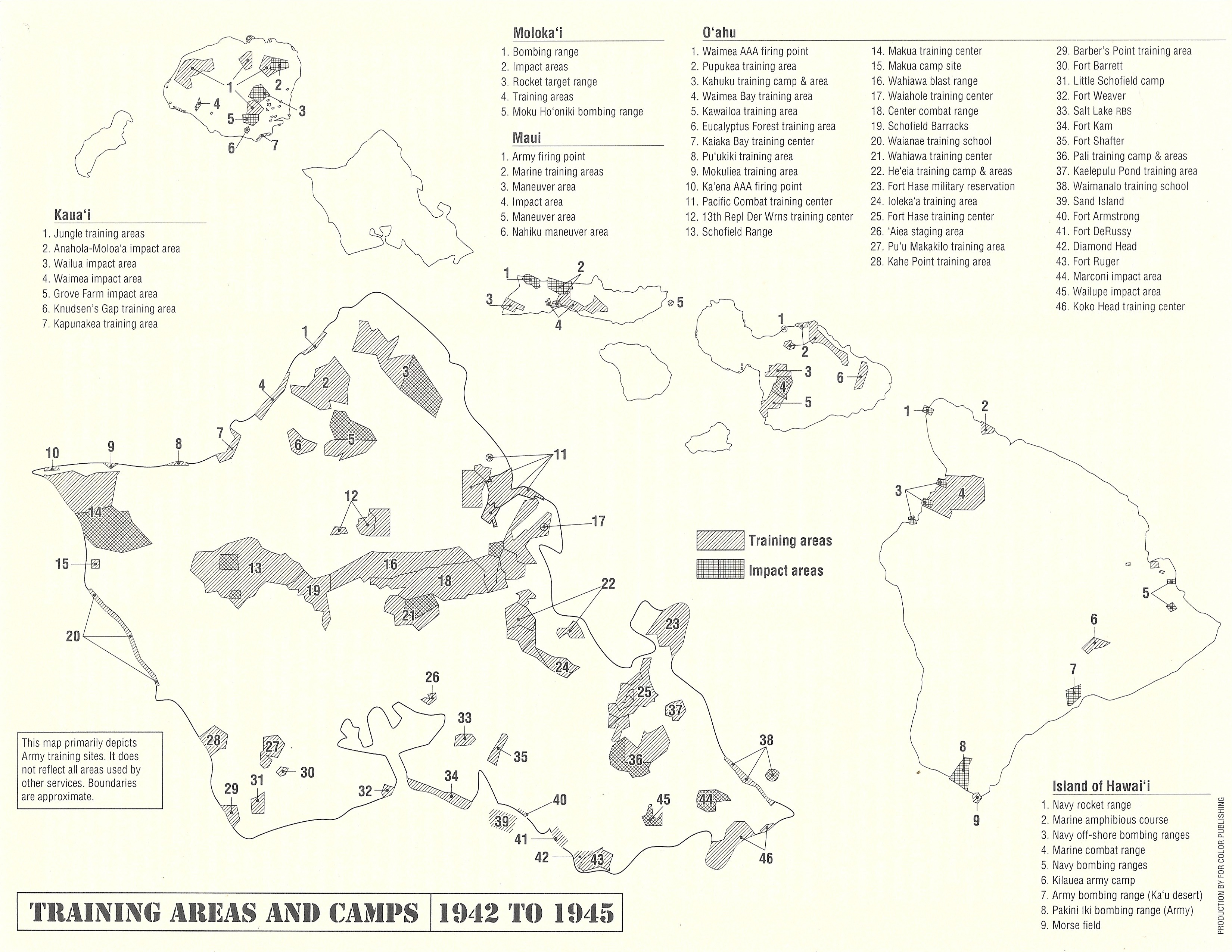 These sites appear on a 1946 map of training areas prepared by the Army and contained in a report titled “TRAFAC: Training Facilities and Data Relative Thereto” (no date). The G-3 History, to which the TRAFAC report is annexed, acknowledges that “certain facilities established during the war were closed prior to the cessation of hostilities and are, therefore, omitted from these maps.” Some of the omissions are significant. The G-3 History lists them as follows:
