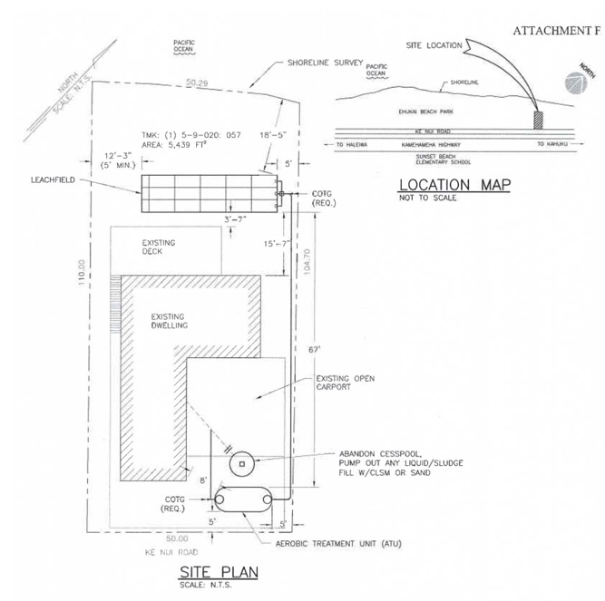 At present, she noted, the house at 59-297 Ke Nui Road “is currently a 3 bedroom/2 bath home that is connected to a cesspool that is at least 10 feet deep. When designing individual wastewater systems, we use 200-gallons-per-day for a bedroom. Based on that information, the existing design flow of the cesspool is … 600 gpd. The owners plan on adding another bedroom and a den, which we consider a bedroom-like room, so the design will be 5 bedrooms x 200 gpd = 1,000 gpd.”
