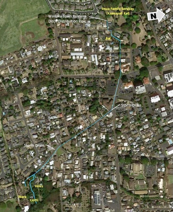 In the case of the Wailuku Town kuleana ʻauwai, there are only four users. Imua Family Services, located near the top, takes water from a pipe controlled by WWC that then goes underground for about 200 feet. The ʻauwai crosses a couple of properties, then runs past the Wailuku public library. Further down, a couple of storm drains intersect the ʻauwai, which then resurfaces toward the end of Kalua Road. After that, it passes through several culverts and under driveways before it comes to a junction that serves the final three users, all of whom grow taro.