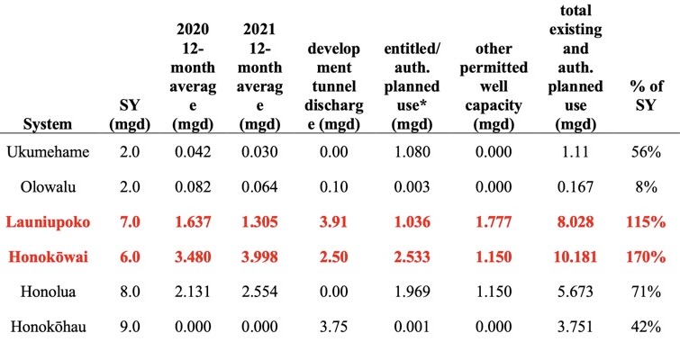 Launiupoko has a sustainable yield of 7 mgd. Current use, development tunnel discharge, authorized planned use, and other permitted well capacity together exceed 8 mgd.