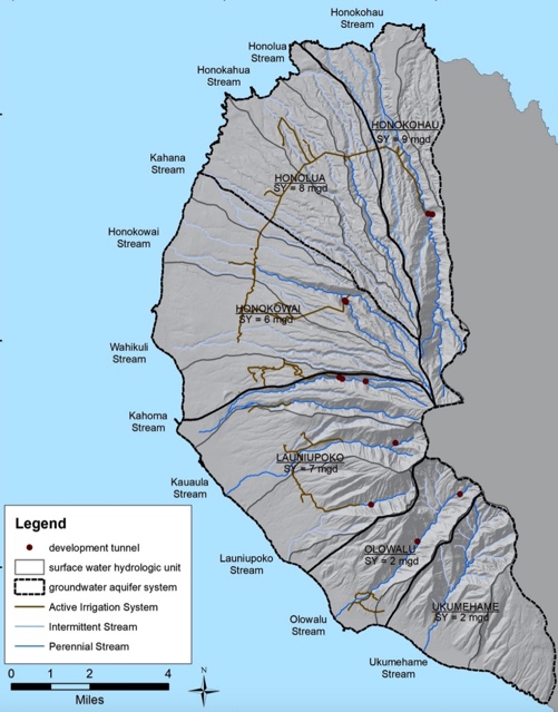 Map: Ground water Aquifer Systems Areas and their sustainable yields (SY) for the Lahaina Aquifer Sector with overlaying surface water hydrologic units and their perennial and intermittent streams with development tunnels and active irrigation ditch systems. Credit: CWRM