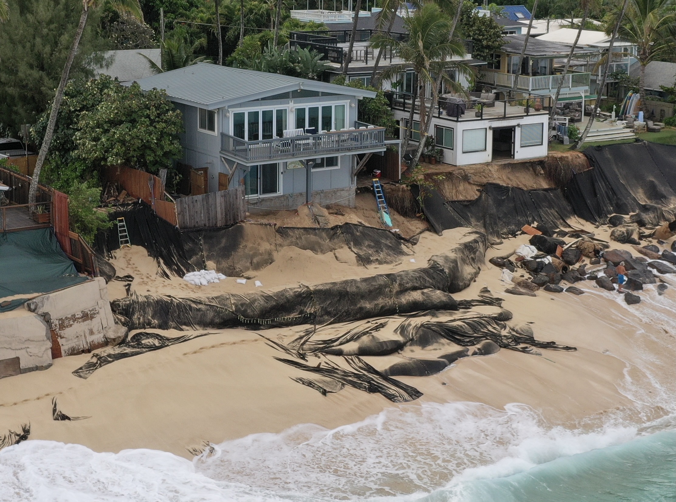 Sandbag Burritos: Act 209 (House Bill 2006) attempts to address the problem of large sandbags – also called sandbag burritos – that have been used by owners of eroding coastal properties to protect their homes. The bill does nothing to change the ability of the Board of Land and Natural Resources to issue the emergency permits. All it does is require the board to “include as a condition [of the permit] a requirement for the attachment of identifying information … and the permit number to the sandbag.” BLNR chair Case, the only person to testify on the measure, was less than enthusiastic. Her department, she said had investigated reports of torn bags and other debris that has washed up on the beach. “This debris has typically come from propylene bags and other plastic materials that have not been authorized for use. We are concerned that any identifying tags attached to sandbag burritos might also tear off and become debris.”