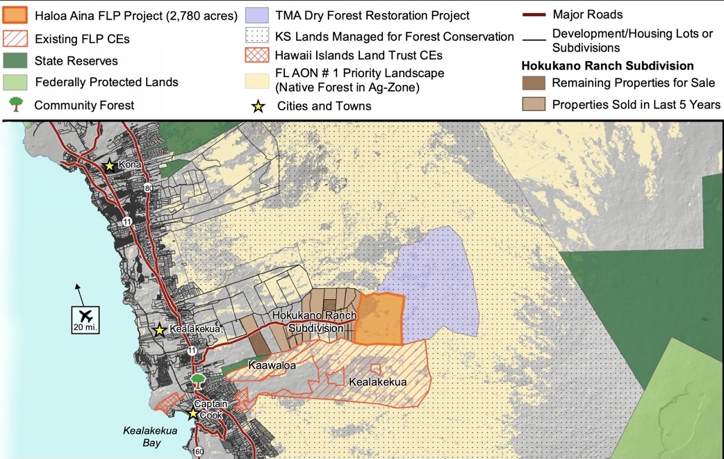 “This project will connect over 400,000 contiguous acres of adjacent managed forests including two Forest Legacy project conservation easements also held by the state (Kealakekua Mountain Reserve and Kaʻawaloa), forested lands managed by Kamehameha Schools for forestry and conservation, and Hawaiʻi Volcanoes National Park, creating a large contiguous managed forest landscape,” it continues.