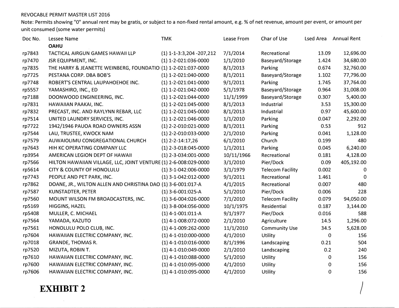 This year, members of the public and the Land Board took the division to task for not providing even basic information about each of the permits to be renewed. The list it provided contained the name of each permittee, the tax map key number for the property, the date the permit was first issued, the character of use (i.e., parking, church, recreational, agriculture), the land area, and the annual rent.