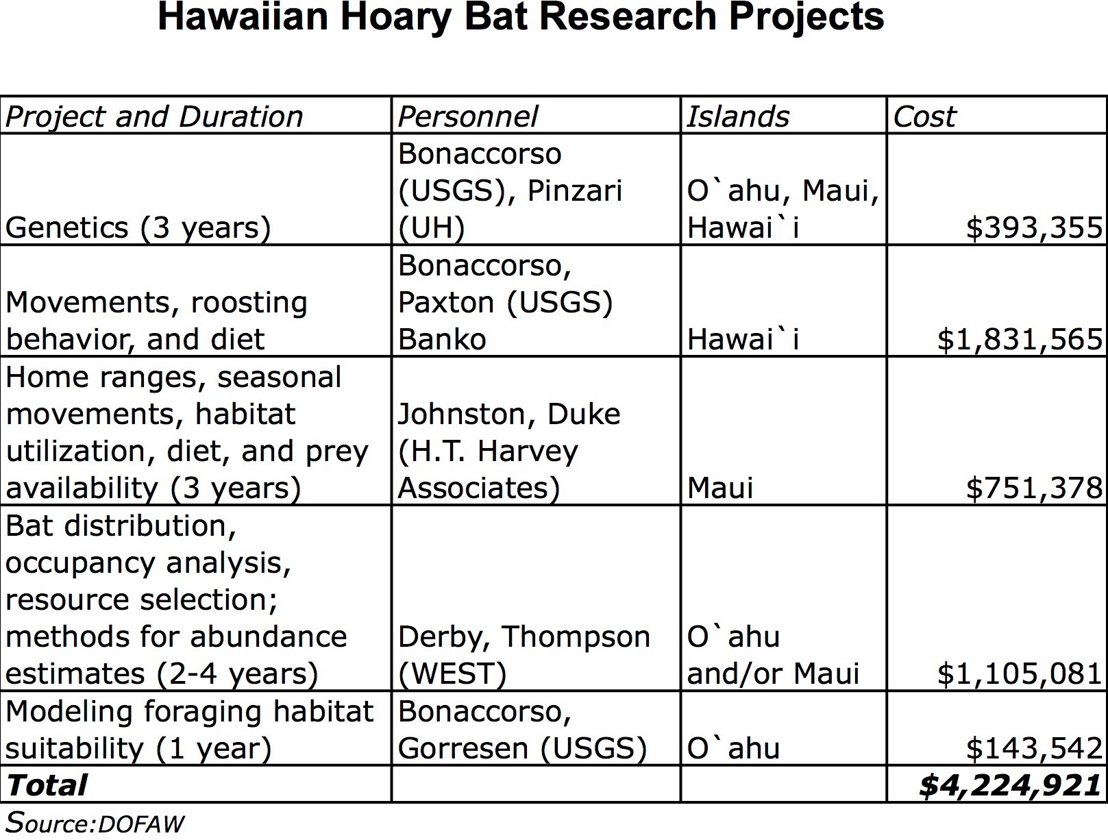 Operators of Hawai`i’s wind farms are poised to spend more than $4 million on efforts to fill critical knowledge gaps regarding the endangered Hawaiian hoary bat, and may eventually spend up to $6 million.
